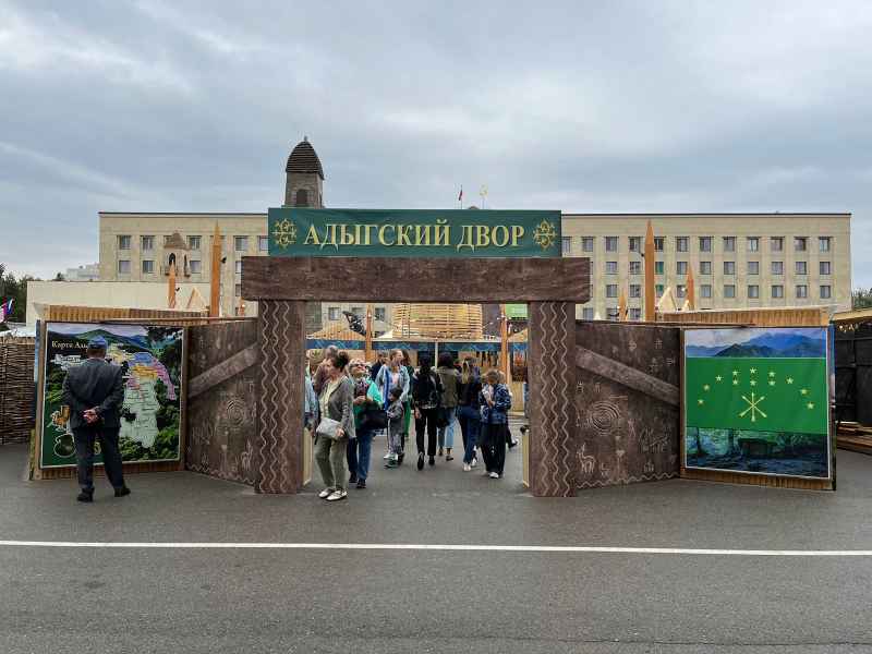 Импровизированный адыгский двор в выставке-ярмарке «Национальные подворья народов Юга России» представил работы по: золотошвейному искусству адыгов (черкесов), художественной обработке дерева, войлоковалянию, художественному ручному вязанию крючком, пошиву адыгских национальных костюмов, а также адыгская сувенирная продукция. Посетители праздника с большим интересом принимали участие в мастер-классах по: басонному плетению, войлоковалянию, итоговой обработке и сборке трещоток, тканью галуна, ручному вязанию и городской вышивке.