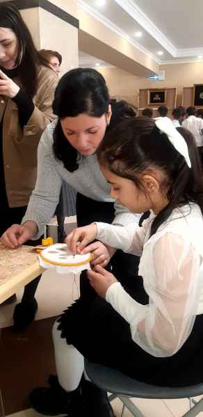В рамках выставки также состоялась творческая встреча с мастером золотошвейного искусства Марет Тлемешок, которая рассказала детям про свое творчество.
